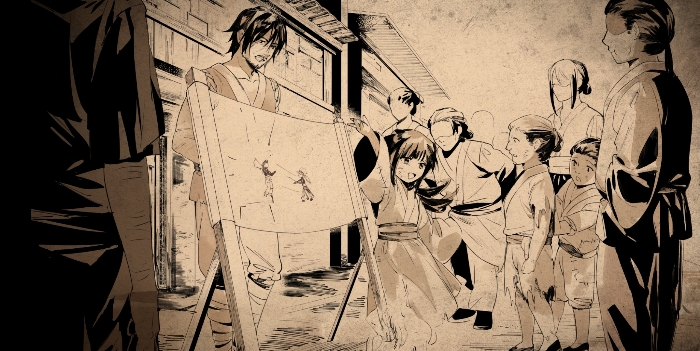 爹爹在街边吆喝着,吸引着来来往往的路人来看戏。