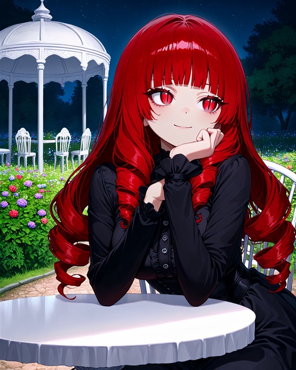 她有着一头血红的公主卷长发。