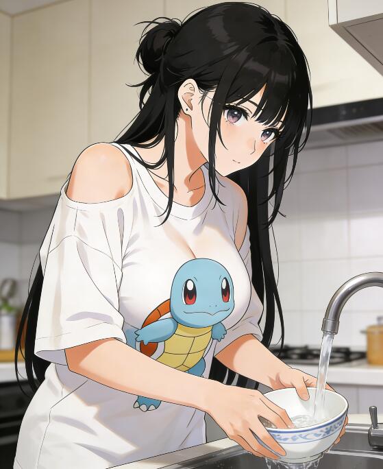 她的肩膀线条单薄,香肩露出随着洗碗的动作轻轻起伏。