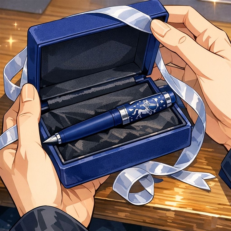 深蓝色的笔身,哑光质感,笔帽上面刻有精美的星座图案——那就是他的星座,射手座。