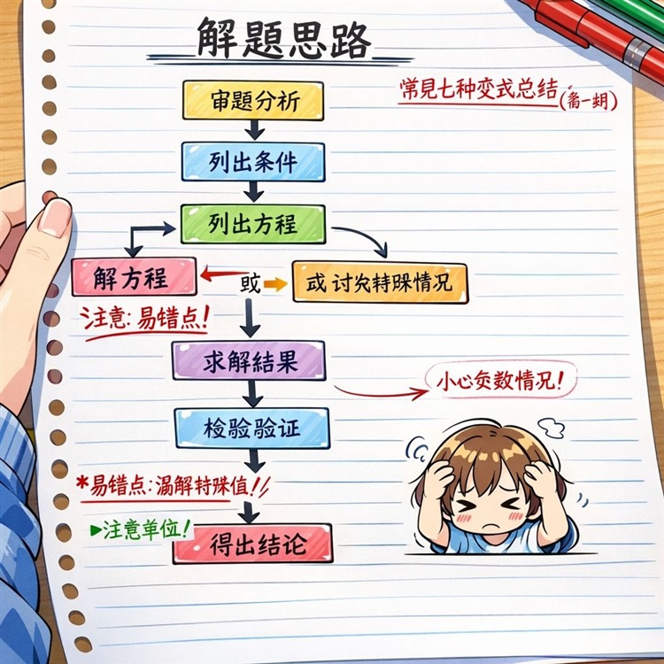 纸上画着清楚的解题思路图,每一步都做了标记,并且用不同的颜色笔把容易出错的地方标出来。